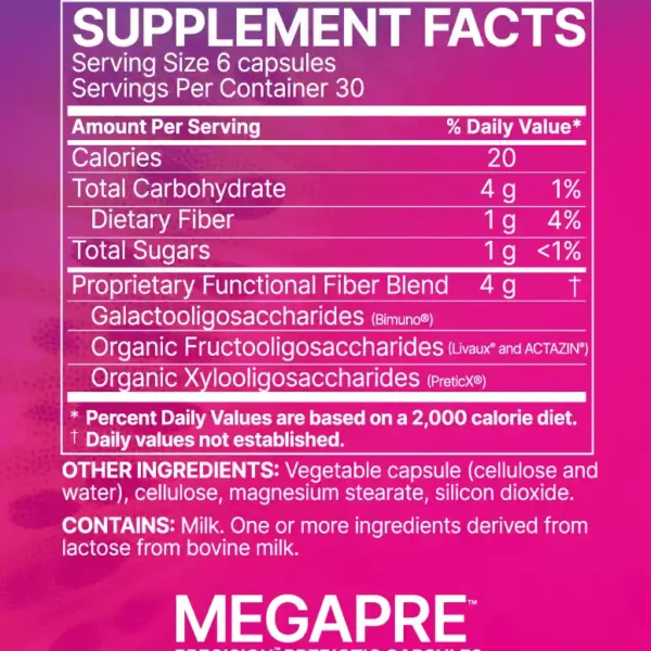 MegaPre contains milk. One or more ingredients are derived from lactose from bovine milk. Exercise caution if you have lactose intolerance or diary sensitivities.